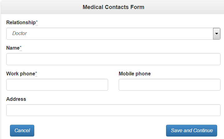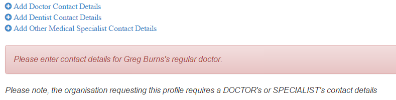 Please note that all sections of a profile should contain information of the person whose medical details are being requested, and sections with Skip buttons are optional. In the example below, Greg Burns' medical details are being asked; thus, Greg Burns' information should be entered.