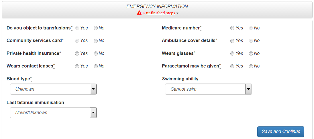 4. Emergency Information - if you answer yes to "Community Services Card", "Private Health Insurance", "Medicare Number", and Ambulance cover details", it will ask you for the details.