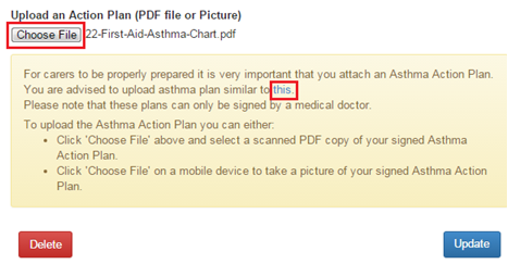 3. At the bottom of the page, select Choose File and find the asthma plan in your computer or smartphone. If the administrator of the organisation uploaded a default action plan, you can download the file by clicking this from the reminder shown below.
