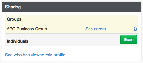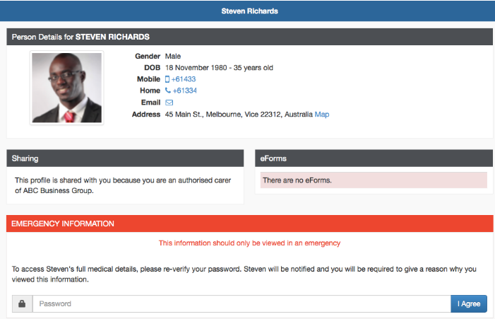 The private information (emergency contacts, medical contacts, emergency information, medical conditions, other conditions and notes) are not accessible to admins or staff carers except when in an emergency. When a staff member tries to access the private information contained on that profile, they will be required to confirm they have a legitimate need for the information as well as provide a reason as to why they require access to the profile. The screenshot below shows how it looks like from a staff carer's view: